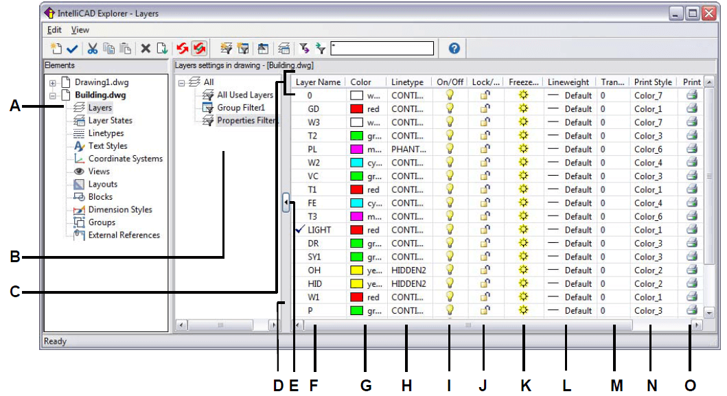 Há uma grande variedade de novos aprimoramentos de gestão de layers no CMS IntelliCAD 8.x: Estados de Layers, Filtros de Layers, Controle de Pesquisa de Layer (Layer Explorer), Novas Propriedades de Layers no Explorer (Transparência, Novo VP Freeze), Nova barra de ferramentas de ferramentas de Layers e menu de novas ferramentas de Leyers. Layers no CMS IntelliCAD são como as sobreposições transparentes que se usa na elaboração de desenho.