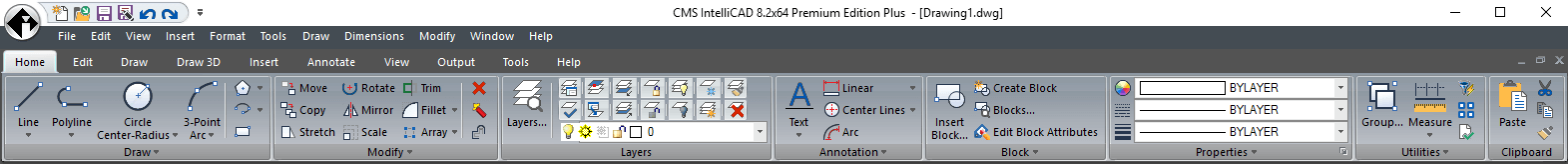 Os comandos CMS IntelliCAD® também podem ser implementados a partir do menu suspenso do IntelliCAD escolhendo-os na lista disponível de opções de menu. As opções de menu disponíveis dependem do nível de experiência definido nas opções gerais do IntelliCAD. Os utilizadores podem usar a interface Ribbon standard e o menu suspenso IntelliCAD. Barra de menus do IntelliCAD não está disponível por padrão mas pode ser facilmente activada com um clique do mouse direito na parte superior do IntelliCAD Ribbons.