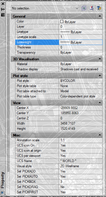 No painel Propriedades, as alterações feitas nos campos Layer, Color, Thickness, Espessura da linha, Tipo de Linha, Escala de tipo de linha e Estilo de Impressão (se usar tabelas de estilo de impressão nomeadas) afectam todas as entidades seleccionadas. Para alterar as propriedades de uma única entidade no conjunto de selecção, escolha a entidade na lista na parte superior do painel Propriedades. Os usuários podem seleccionar as entidades a serem alteradas usando qualquer método de selecção de entidade. Além disso, o IntelliCAD possui a opção de controlar a transparência da janela Painel de propriedades.